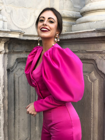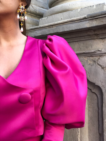Traje confeccionado en raso fucsia compuesto por cuerpo cruzado con escote delantero y mangas abullonadas y pantalón recto de tiro alto .